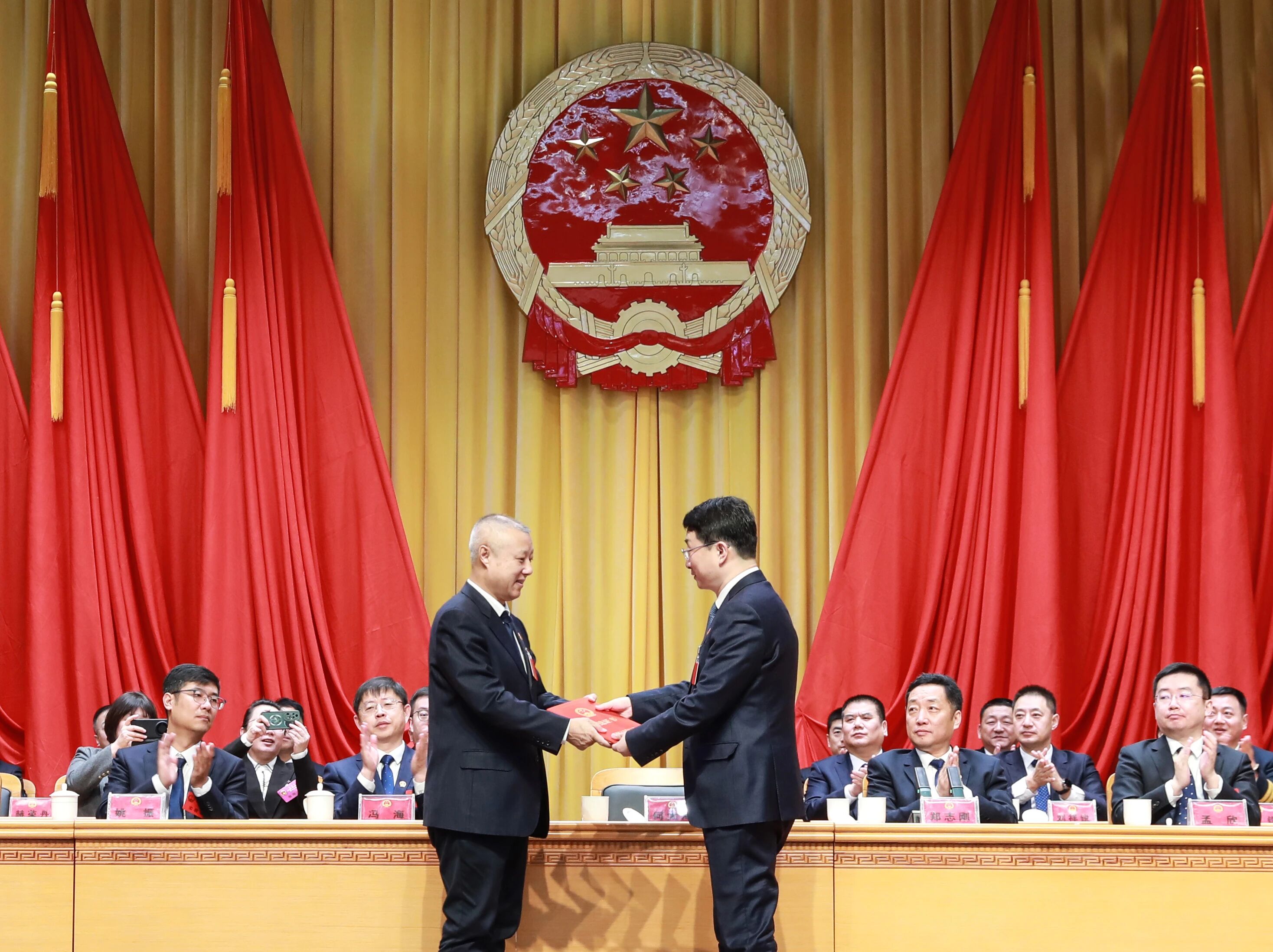 会议举行宪法宣誓仪式。新当选人员在大会主席团和全体代表的见证下,向宪法宣誓。
