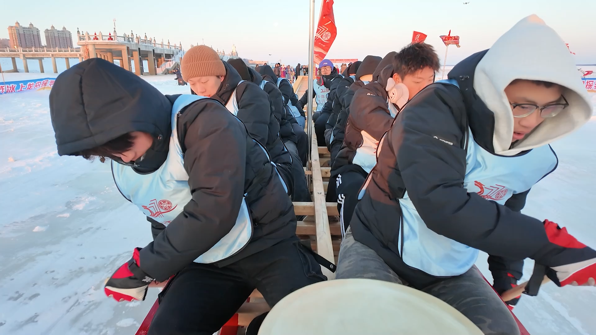 随着开赛指令下达,队员们紧握冰钎、合力挥桨,奋力向前冲刺。现场欢呼声、呐喊声此起彼伏,两艘龙舟在冰面划出昂扬奋进的轨迹,生动诠释着龙江儿女不屈不挠的拼搏精神。