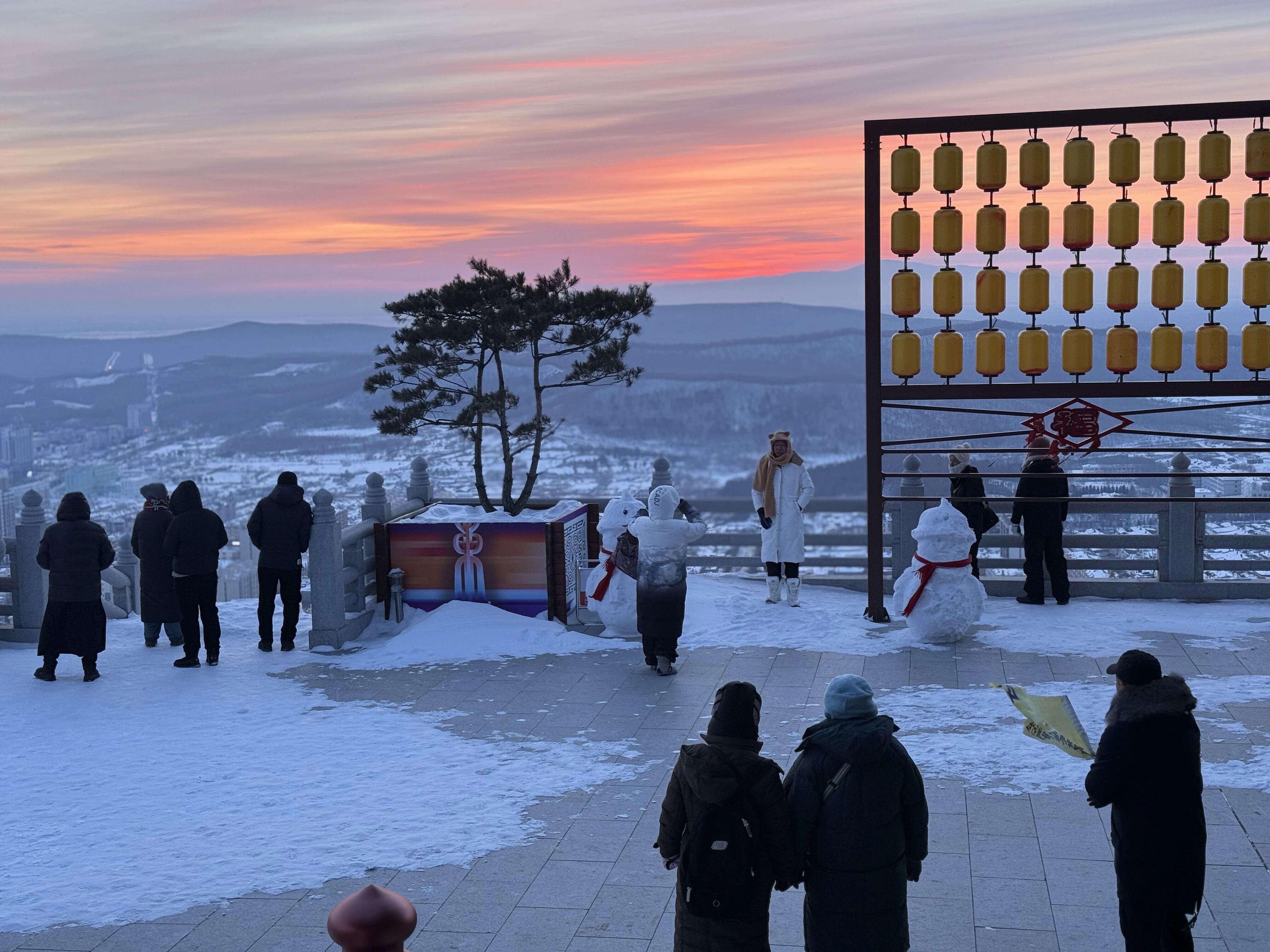 清晨时分,东极阁上游人如织。各地游客迎着寒风,静候马年新春的第一缕阳光。天际由青渐红,红日跃出界江,将皑皑白雪与边境小城尽数染成金色。大家纷纷举起手机,定格这满含希望的美好瞬间。