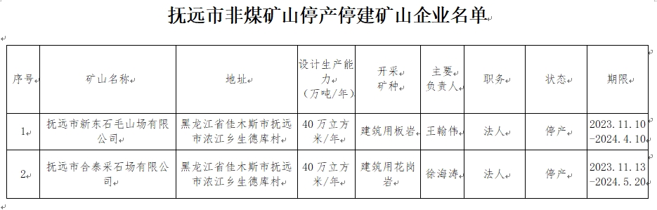根据省应急管理厅印发《金属非金属矿山企业复产复工工作指南》(黑应急规〔2019〕2号)中关于停产停建的工作程序要求,按照企业自行申报的原则,抚远市新东石毛山场有限公司于2023年11月10日至2024年4月10日,进行季节性停产。抚远合泰采石场有限公司于2023年11月13日至2024年5月20日,进行季节性停产。 现予以公示。