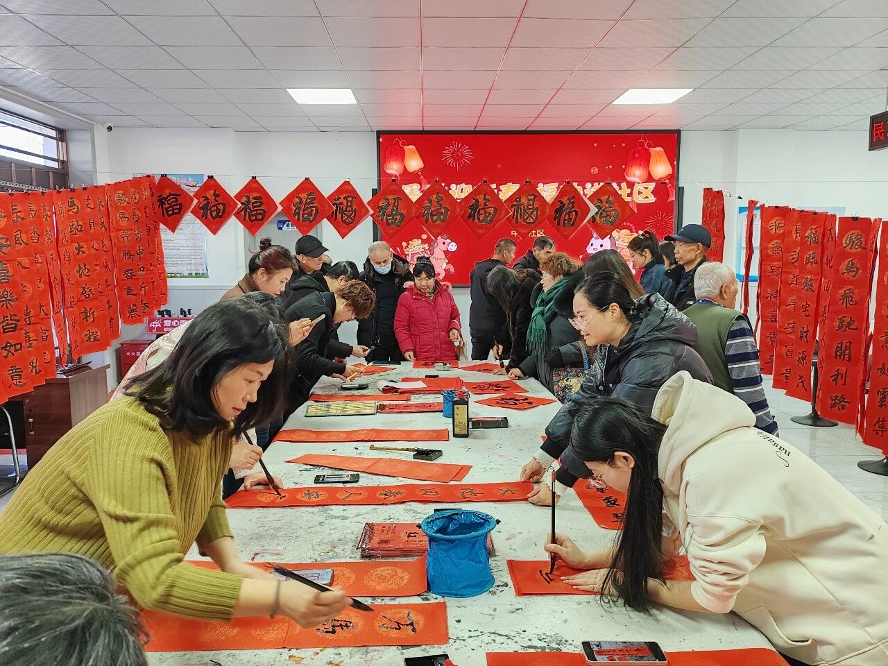 活动现场暖意融融、墨香四溢。社区特别邀请专业书法老师亲临现场,挥毫泼墨、落笔生花,红纸铺展,浓墨饱蘸,一笔一画尽显深厚功底。老师们随心挥洒,一幅幅寓意吉祥、对仗工整的春联跃然纸上,“福到财到气运到”“家和业顺万事兴”“岁岁平安添百福”等经典佳句,搭配喜庆饱满的福字,笔墨间满是新春的美好祈愿,红纸黑字相映成趣,年味扑面而来。