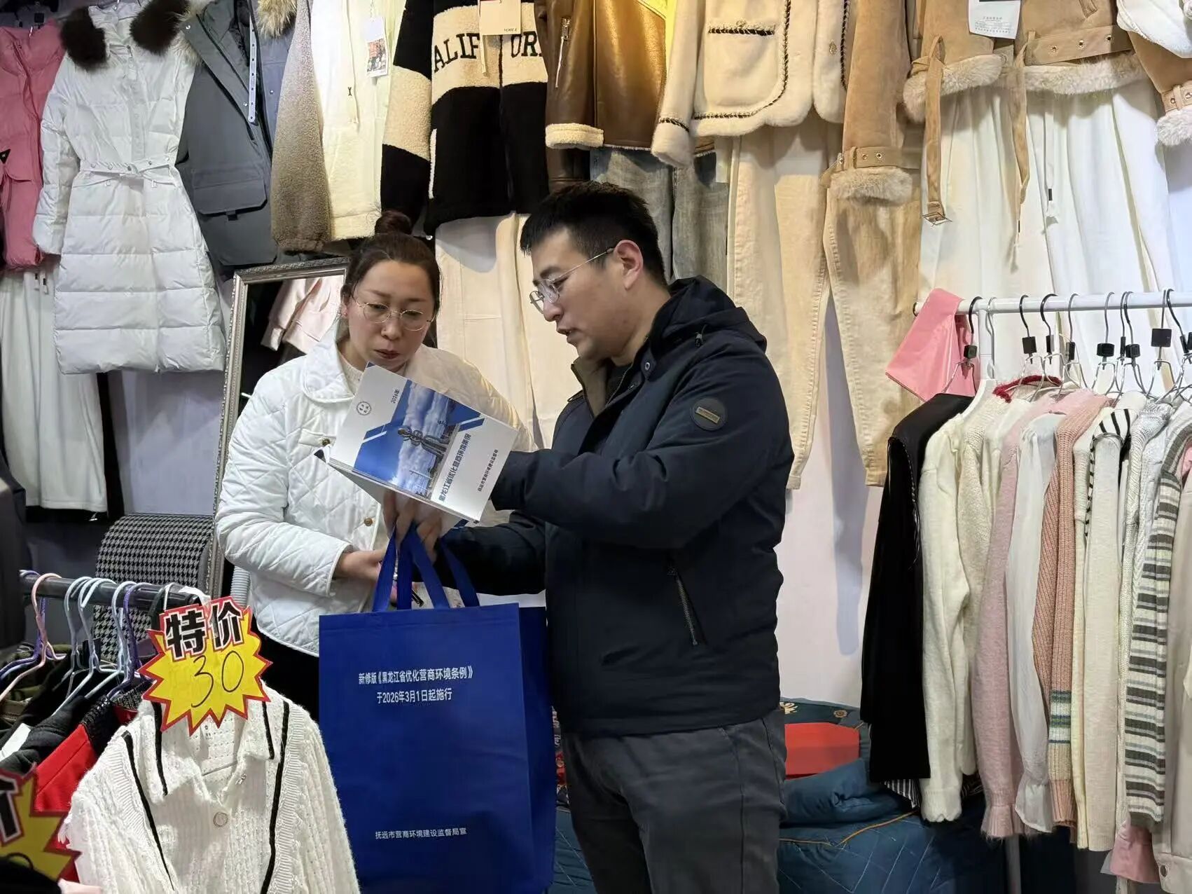 为深入学习宣传贯彻2026年新修订《黑龙江省优化营商环境条例》,精准解读《条例》修订亮点,推动政策精神落地见效,3月15日,抚远市营商环境局组织开展宣传活动,通过“阵地宣传+精准服务”“图文解读+现场互动”的多元形式,有效打通政策落地“最后一公里”,推动惠企便民政策直达基层、直抵人心。