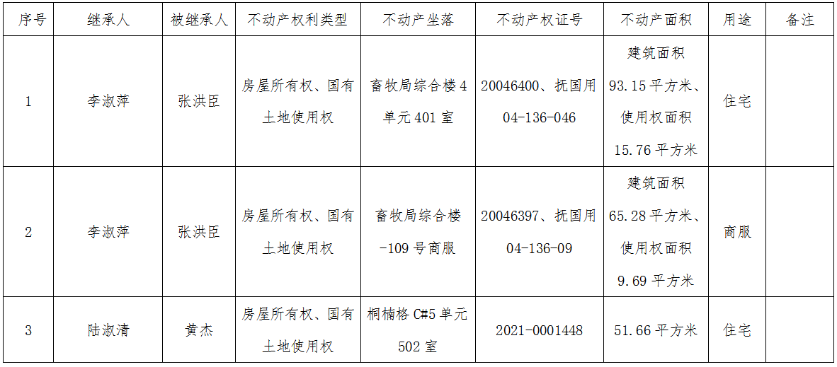 经初步审定,我机构拟对下列不动产权利予以继承登记,根据《中华人民共和国民法典》第一百二十四条和《不动产登记暂行条例实施细则》第十七条的规定,现予公告。如有异议,请自本公示之日起二十个工作日内(2026年2月5日之前)持异议书面材料到本登记机构办公场所提出异议,并提供有关材料。逾期无人提出异议,本登记机构将予以登记。