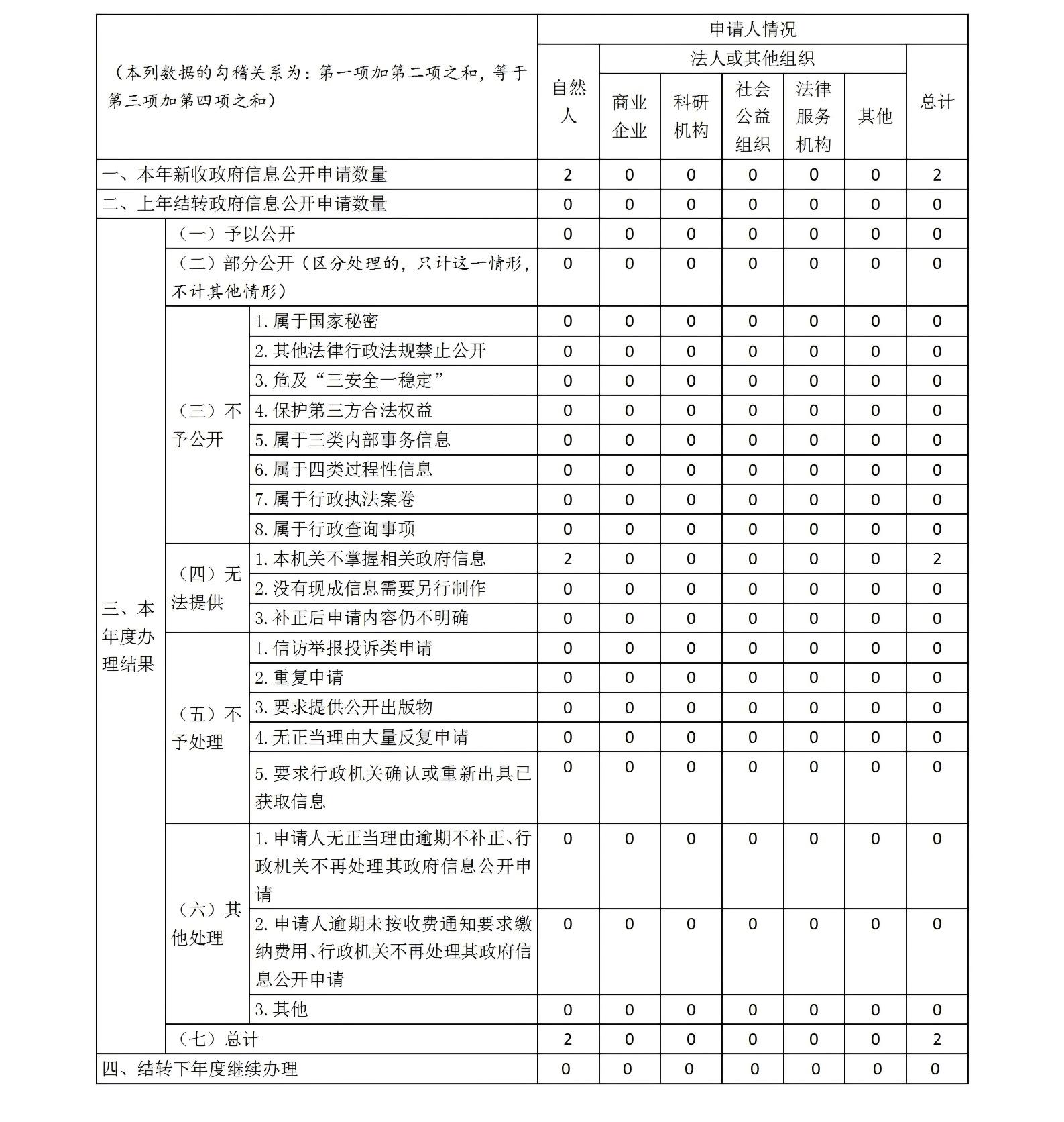 本年度,全局共受理公民、法人及其他组织提出的政府信息公开申请2件。受理后,严格按照《政府信息公开条例》规定的办理流程、答复时限和文书格式,精准核查信息、规范拟定答复,确保申请办理合法合规、及时高效。全年未发生因政府信息公开申请引发的行政复议、行政诉讼案件,依申请公开工作办理质量和群众满意度保持良好态势。